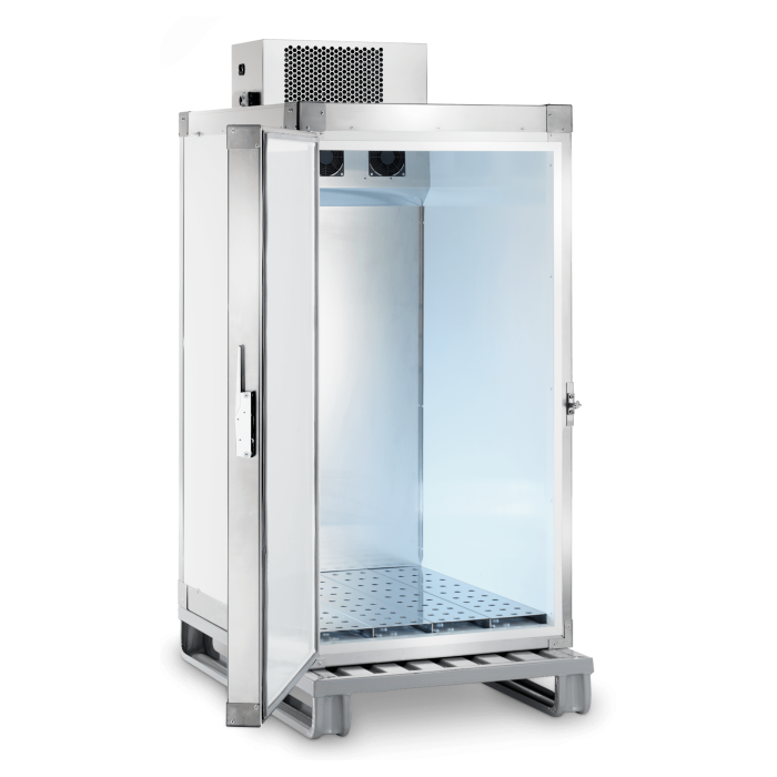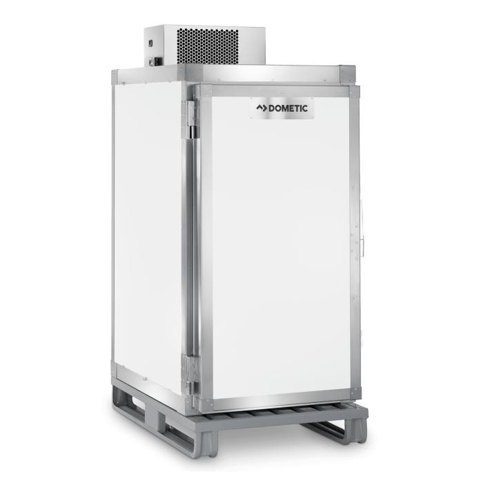 Dometic FO 850NC - Heavy-duty refrigeration container with a factory-preset fixed temperature. The FO850NC is a high-quality fibre glass cabinet for professional use with stainless steel frame and stainless steel base. It has a secure closing system and emergency opening from inside possible. This cooling container is suitable for most common van models, and what's more? It's approved by leading logistic companies.