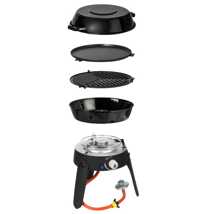 Цей портативний і універсальний газовий барбекю важить менше 4 кг і включає чотири змінні поверхні для приготування їжі та гриля: підставку для каструлі, решітку для гриля з керамічним покриттям GreenGrill і пластину для гриля, а також кришку, яку можна використовувати як горщик. . Повний мангал зберігається в практичній сумці для перенесення (входить в комплект поставки). Safari Chef 30 доступний у версії високого або низького тиску. Safari Chef HP (високий тиск) працює з різьбовим картриджем вагою 500 г (не входить у комплект), який вкручується безпосередньо в пристрій, тоді як Safari Chef LP (низький тиск) можна підключити до звичайного газового балона (шланг і редуктор тиску). не входить). Safari Chef 2 ідеально підходить для кемпінгу, скелелазіння або риболовлі.